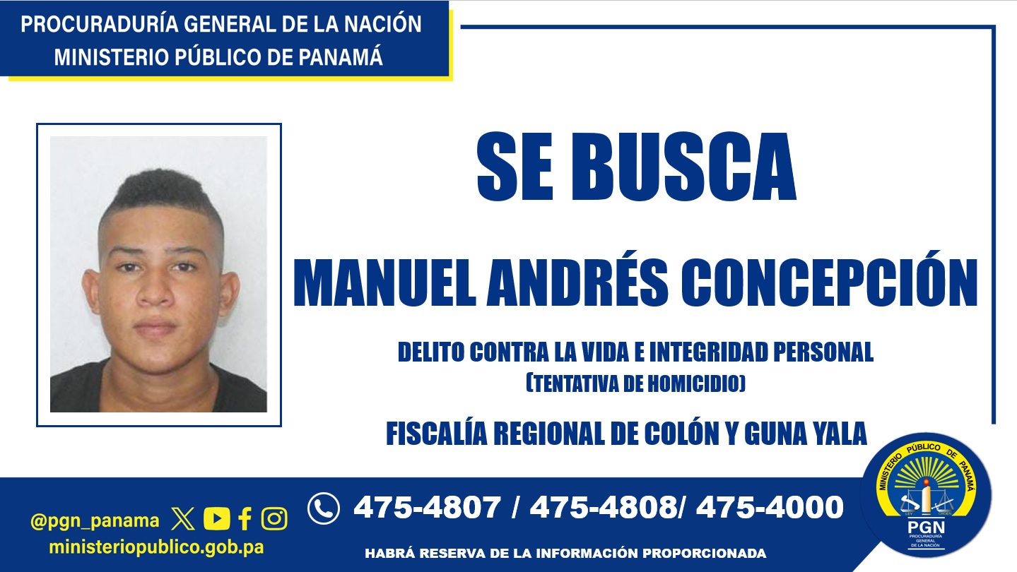 La Procuraduría General de la Nación, a través de la Sección Especializada en Homicidio y Femicidio de la Fiscalía Regional de Colón y Guna Yala, solicita la colaboración de la ciudadanía para dar con la ubicación del ciudadano Manuel Andrés Concepción Villarreta con cédula No. 3-751-1438, toda vez que sobre él se ha emitido una orden de aprehensión.
