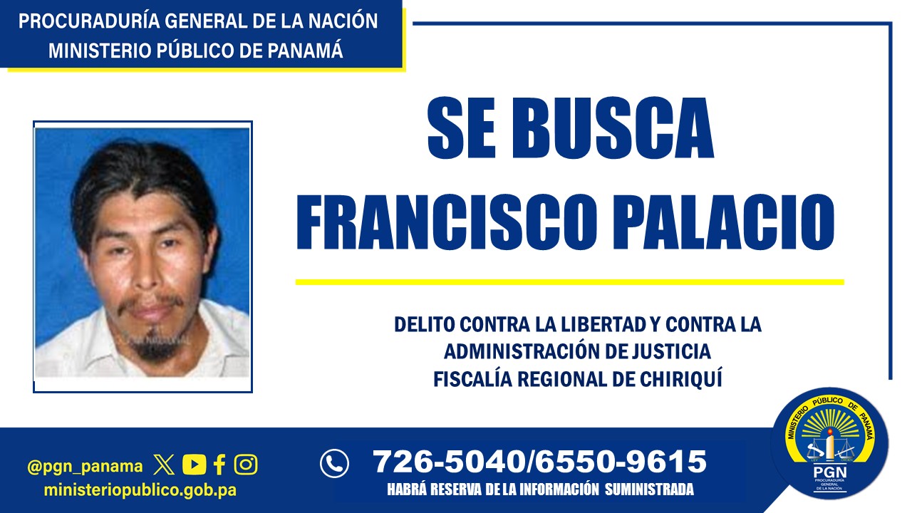 La Procuraduría General de la Nación, a través de la Personería Municipal de San Lorenzo de la Fiscalía Regional de Chiriquí, solicita la colaboración de la ciudadanía para ubicar al ciudadano Francisco Palacio, con cédula de identidad personal 4-795-513, sobre quien pesa una orden de aprehensión.