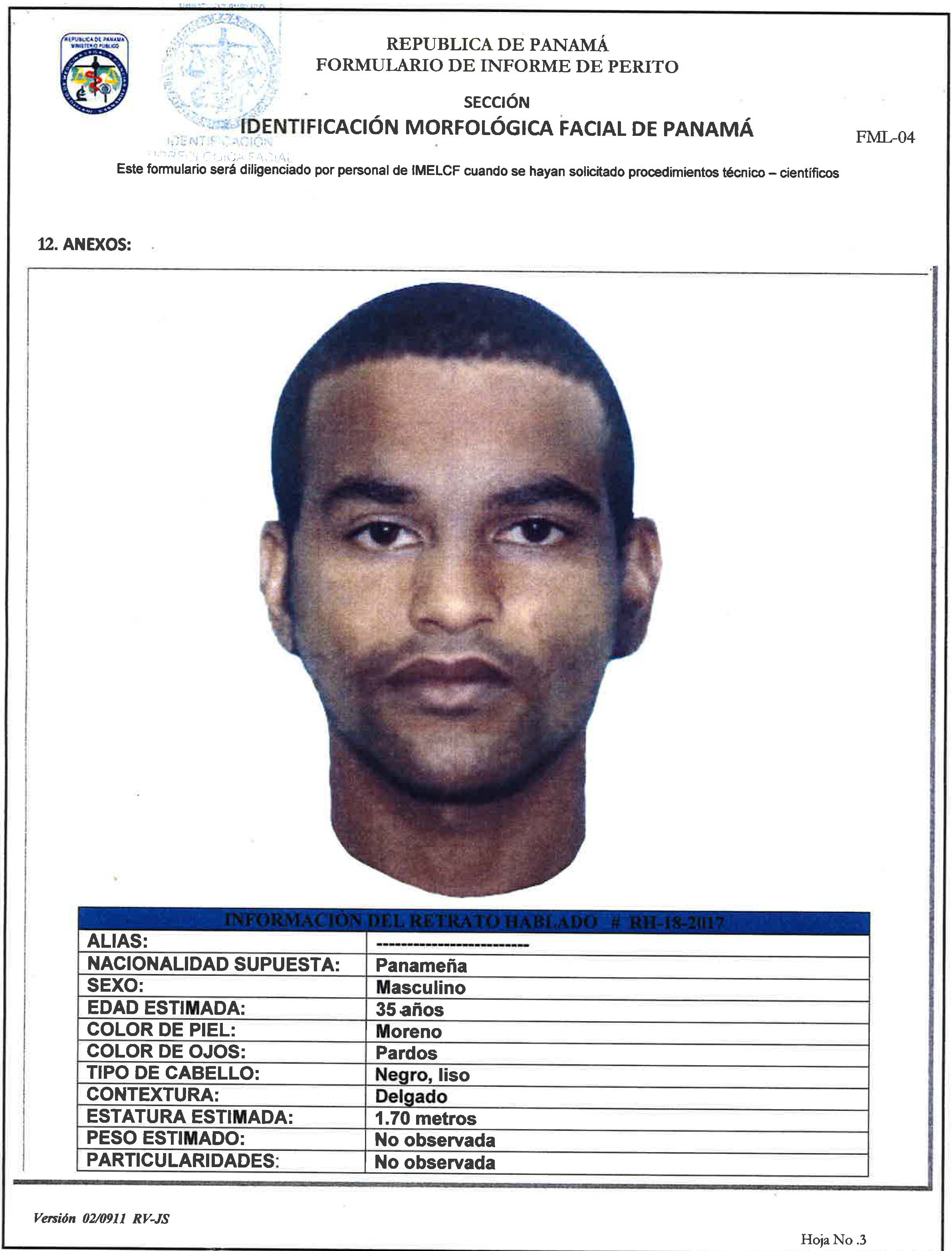 El retrato hablado adjunto, identifica la morfología facial que realizó el Instituto de Medicina Legal y Ciencias Forenses, toda vez que en la diligencia previa de reconocimiento en libros de personas reseñadas el resultado fue negativo.