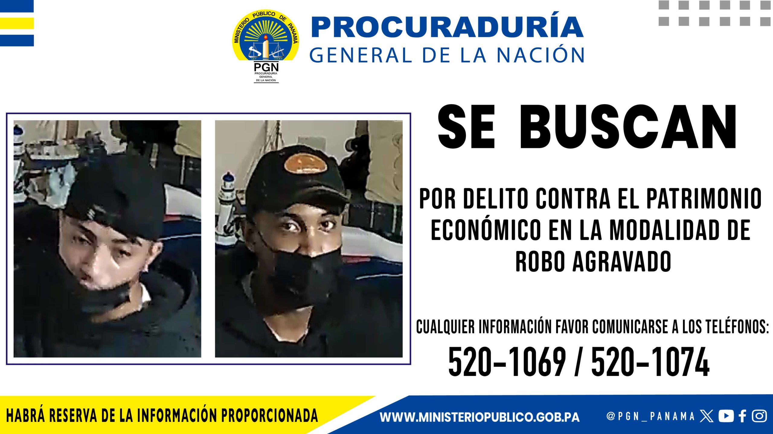 La Sección Segunda de Delitos contra el Patrimonio Económico de la Fiscalía Metropolitana solicita el apoyo a la comunidad en general para identificar a dos hombres por la presunta comisión del delito de robo agravado, en perjuicio de tres personas, ocurrido el 20 de julio de 2022, en una residencia ubicada en Altos de Curundú, corregimiento de Ancón.