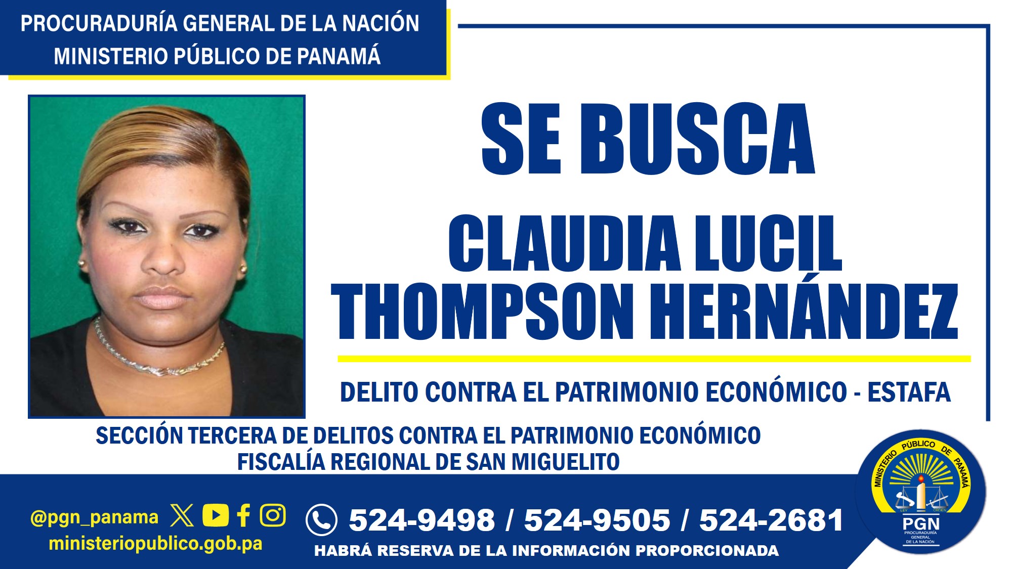 La Sección Tercera de Delitos contra el Patrimonio Económico de la Fiscalía Regional de San Miguelito requiere la colaboración de la ciudadanía para dar con la ubicación de la señora Claudia Lucil Thompson Hernández, de nacionalidad panameña, con número de cédula personal 8-779-939, requerida por el delito de estafa.