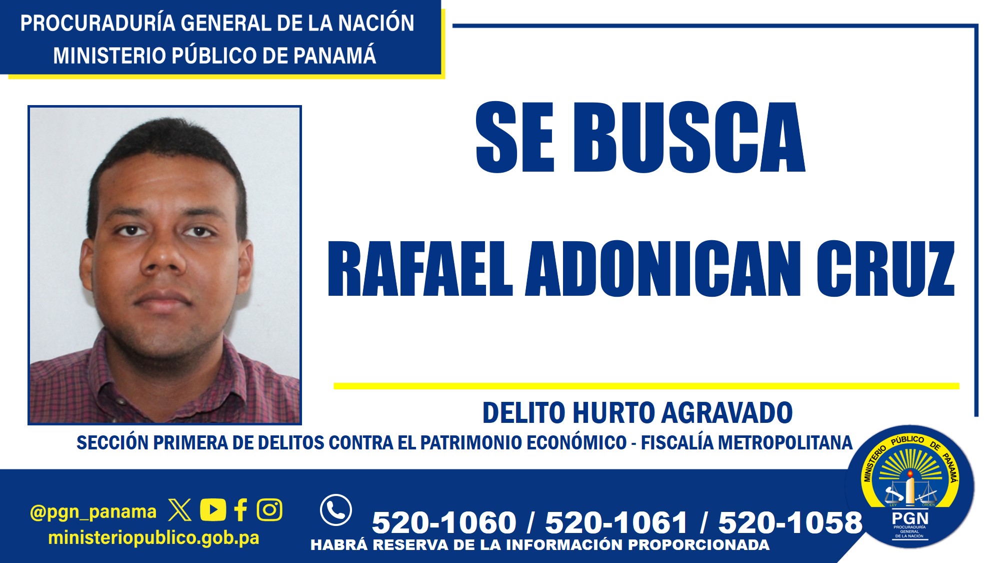 La Sección Primera de Delitos contra el Patrimonio Económico de la Fiscalía Metropolitana requiere la colaboración de la ciudadanía para dar con la ubicación del señor RAFAEL ADONICAN CRUZ, de nacionalidad panameña, con número de cédula personal 8-879-308, requerido por el delito de hurto agravado.