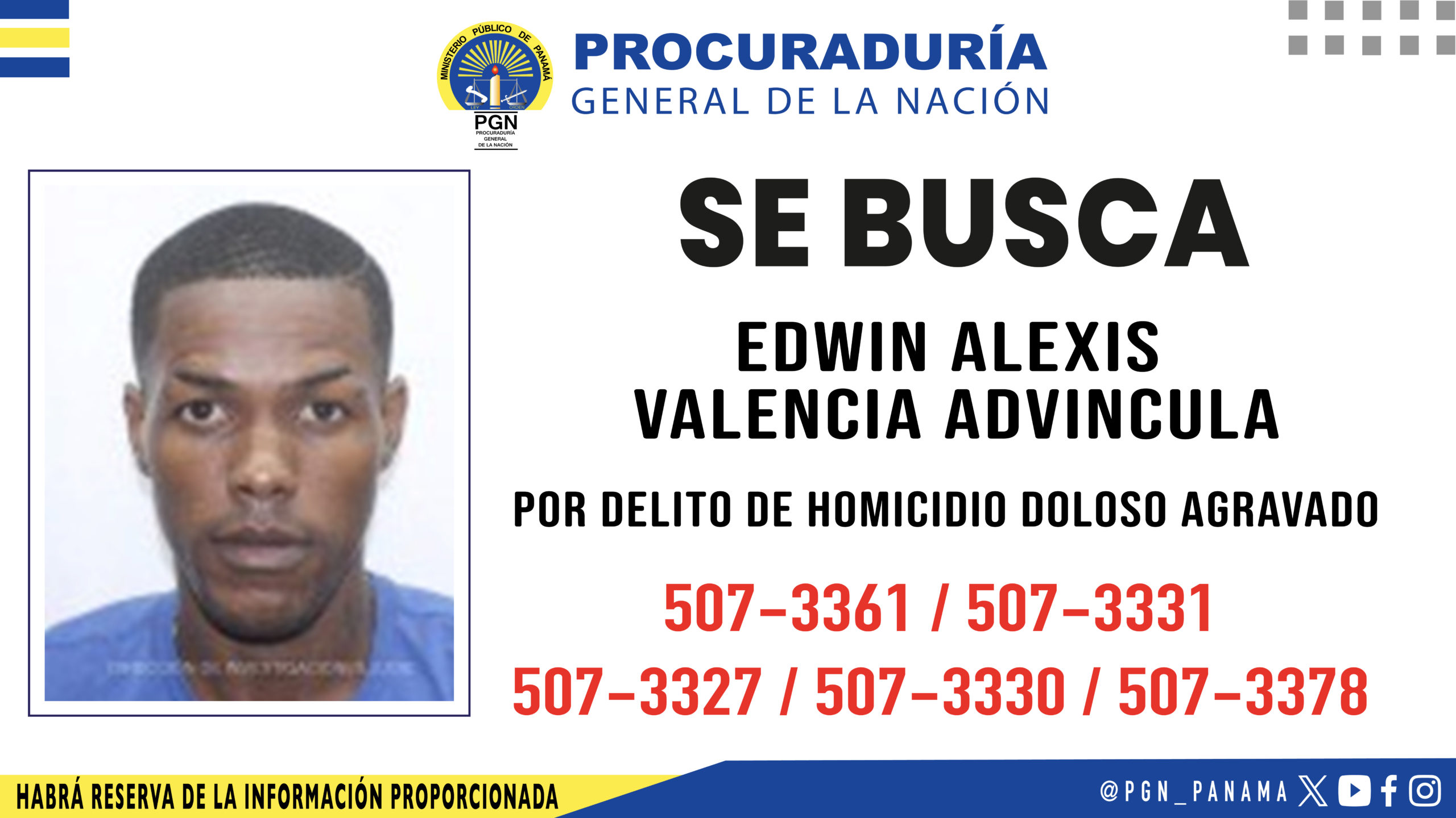 La Sección Especializada en Delitos de Homicidio y Femicidio de la Fiscalía Regional de San Miguelito, solicita la colaboración de la ciudadanía para ubicar al señor Edwin Alexis Valencia Advíncula, investigado por la presunta comisión del delito de contra la vida e integridad personal, en su modalidad de homicidio doloso agravado, en perjuicio de Samuel Enrique Núñez Carrillo.