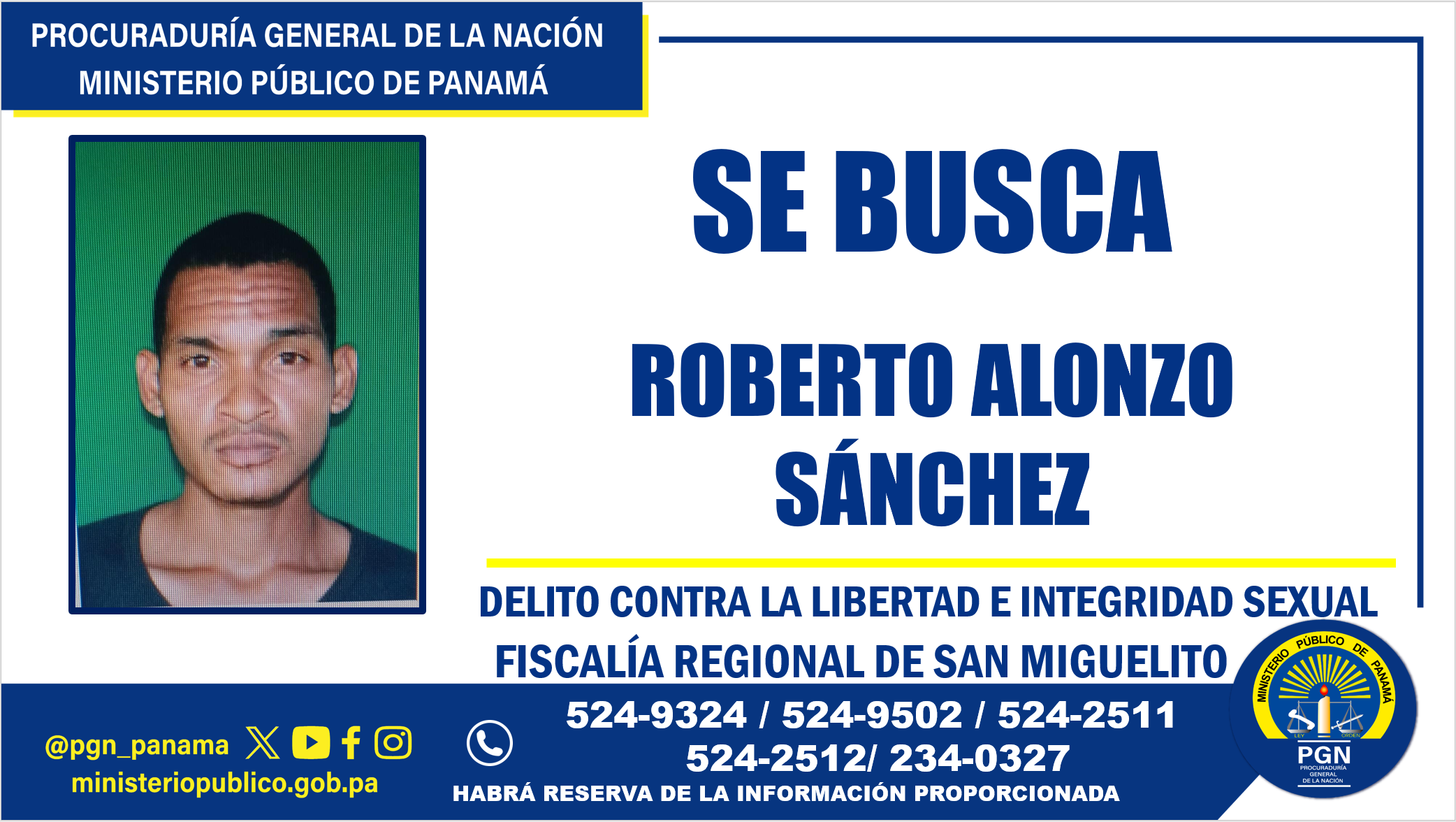 Se le comunica a la ciudadanía que la Fiscalía Regional de San Miguelito, a través de la Sección de Delitos contra la Libertad e Integridad Sexual requiere de su apoyo para ubicar al ciudadano Roberto Alonzo Sánchez, apodado “Parra” con cédula de identidad No. 8-831-1105, presuntamente vinculado a los delitos corrupción de menores y actos libidinosos en perjuicio de una niña.