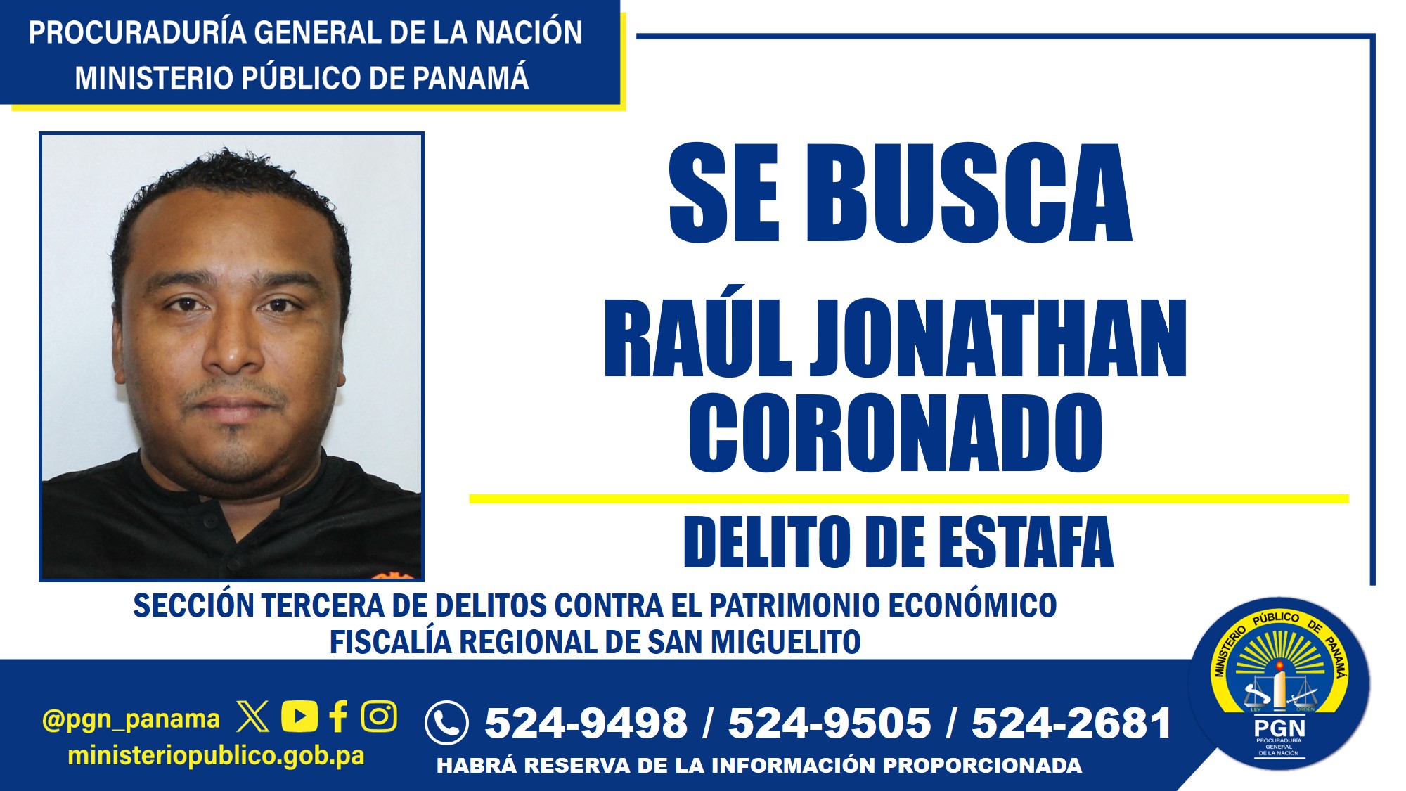 La Sección Tercera de Delitos contra el Patrimonio Económico de la Fiscalía Regional de San Miguelito requiere la colaboración de la ciudadanía para dar con la ubicación del señor Raúl Jonathan Coronado, de nacionalidad panameña, con número de cédula personal 8-771-1046, requerida por el delito de estafa agravada.