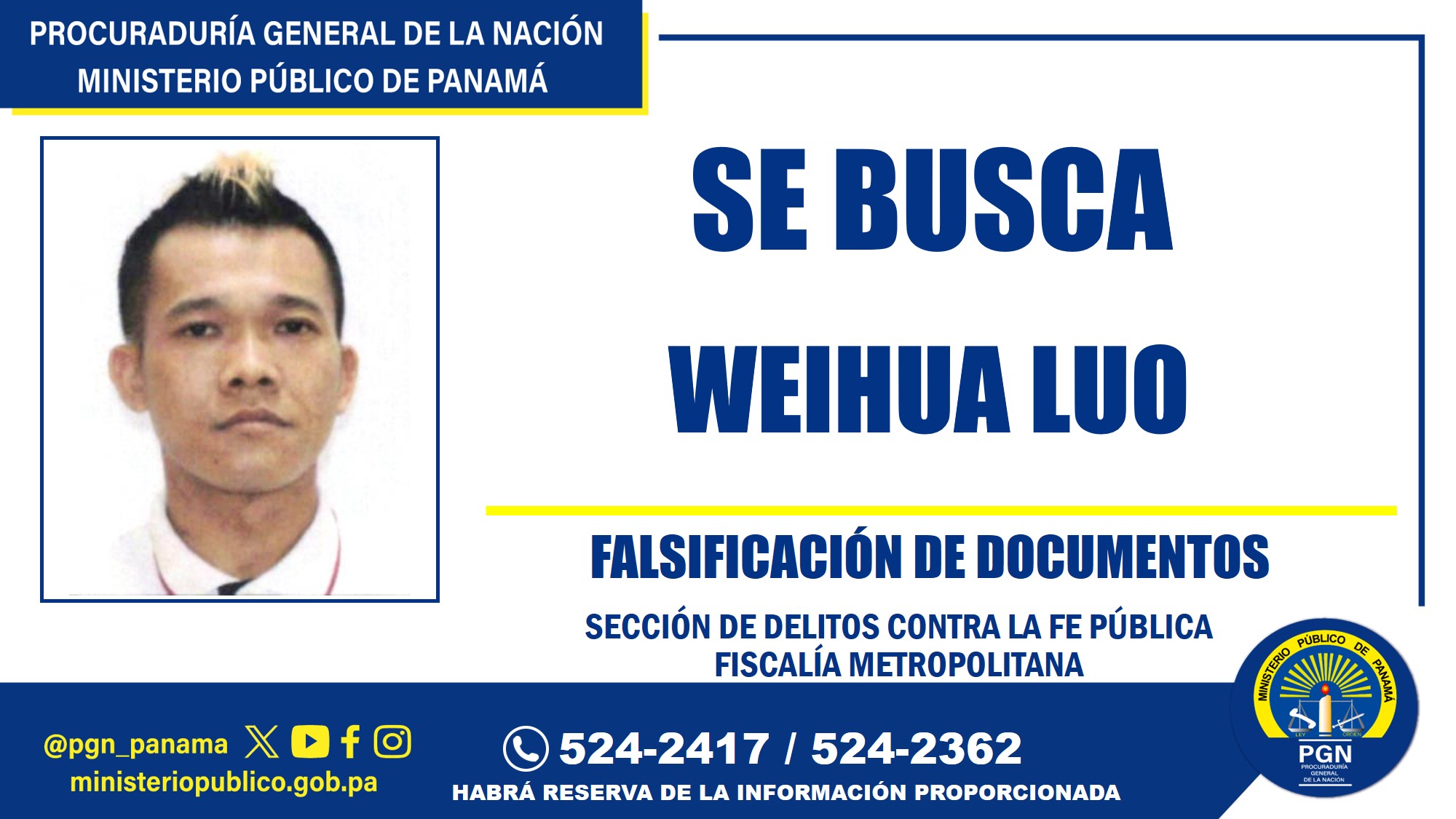 La Procuraduría General de la Nación, a través de la Sección de Delitos contra la Fe Pública de la Fiscalía Metropolitana requiere la colaboración de la ciudadanía para dar con la ubicación del señor Weihua Luo, requerida por el delito de falsificación de documentos en general.