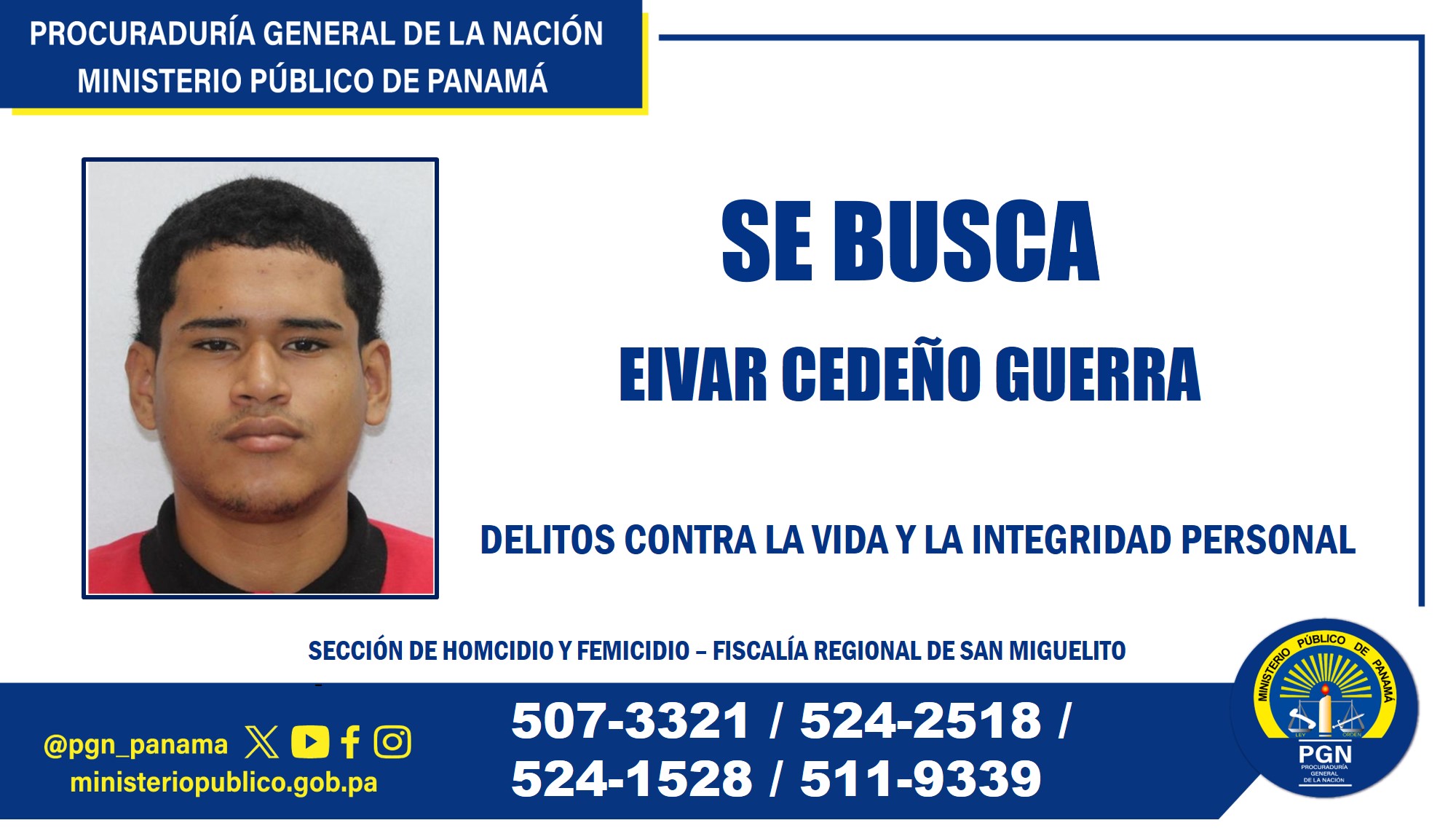 La Sección de Homicidio y Femicidio de la Fiscalía Regional de San Miguelito requiere de colaboración de la ciudadanía para ubicar al ciudadano Eivar Cedeño Guerra con cédula de identidad 4-834-2388 por el delito contra la vida y la integridad personal en la modalidad de homicidio en grado de tentativa en perjuicio de un ciudadano.