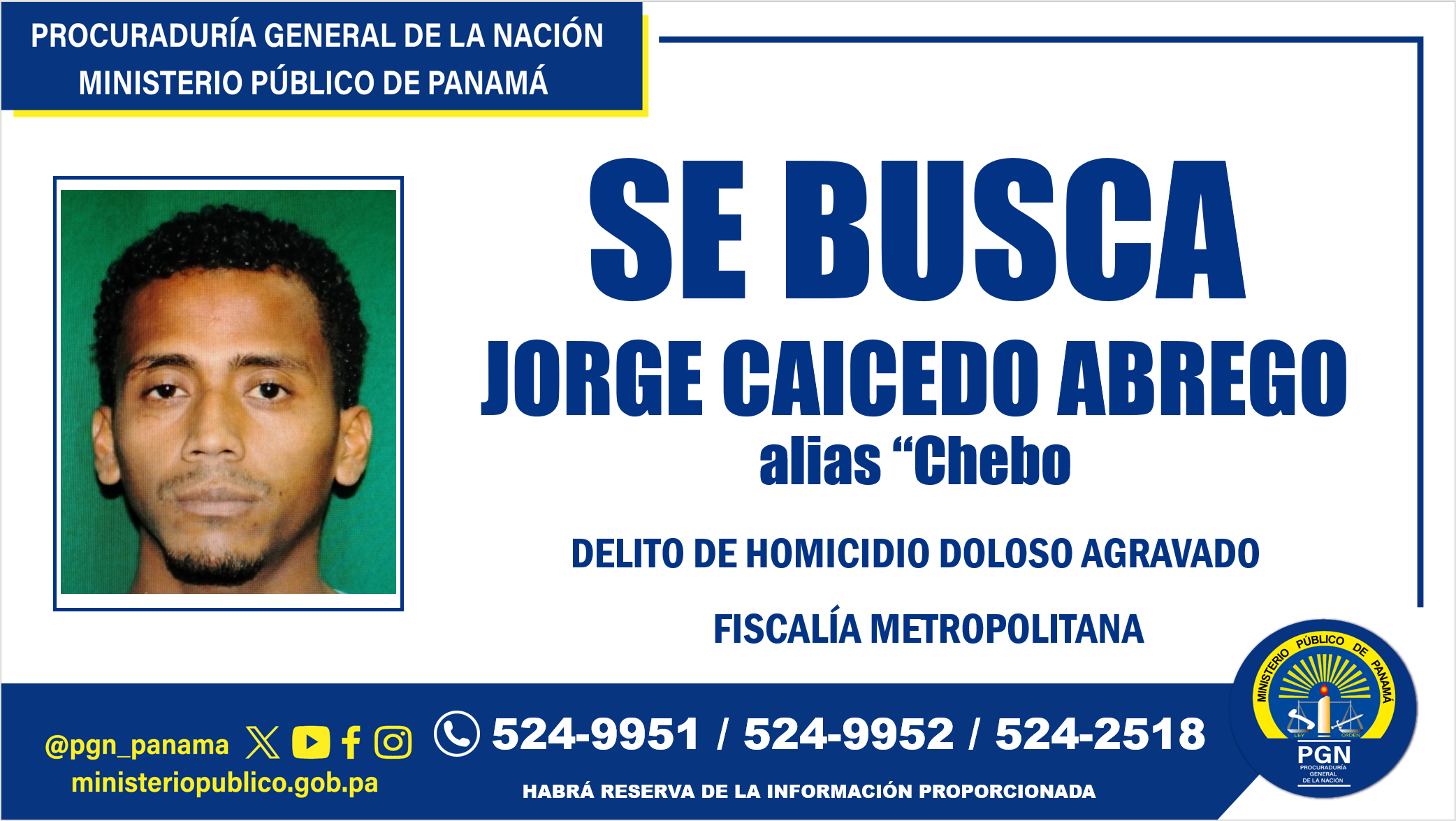 La Sección de Homicidio y Femicidio, de la Fiscalía Metropolitana, solicita la colaboración de la ciudadanía para ubicar al ciudadano Jorge Ariel Caicedo Abrego, alias “Chebo”, con cédula 8-835-2471, requerido con orden de aprehensión, del 3 de diciembre 2024, investigado por homicidio doloso agravado ocurrido el 25 de noviembre de 2024.
