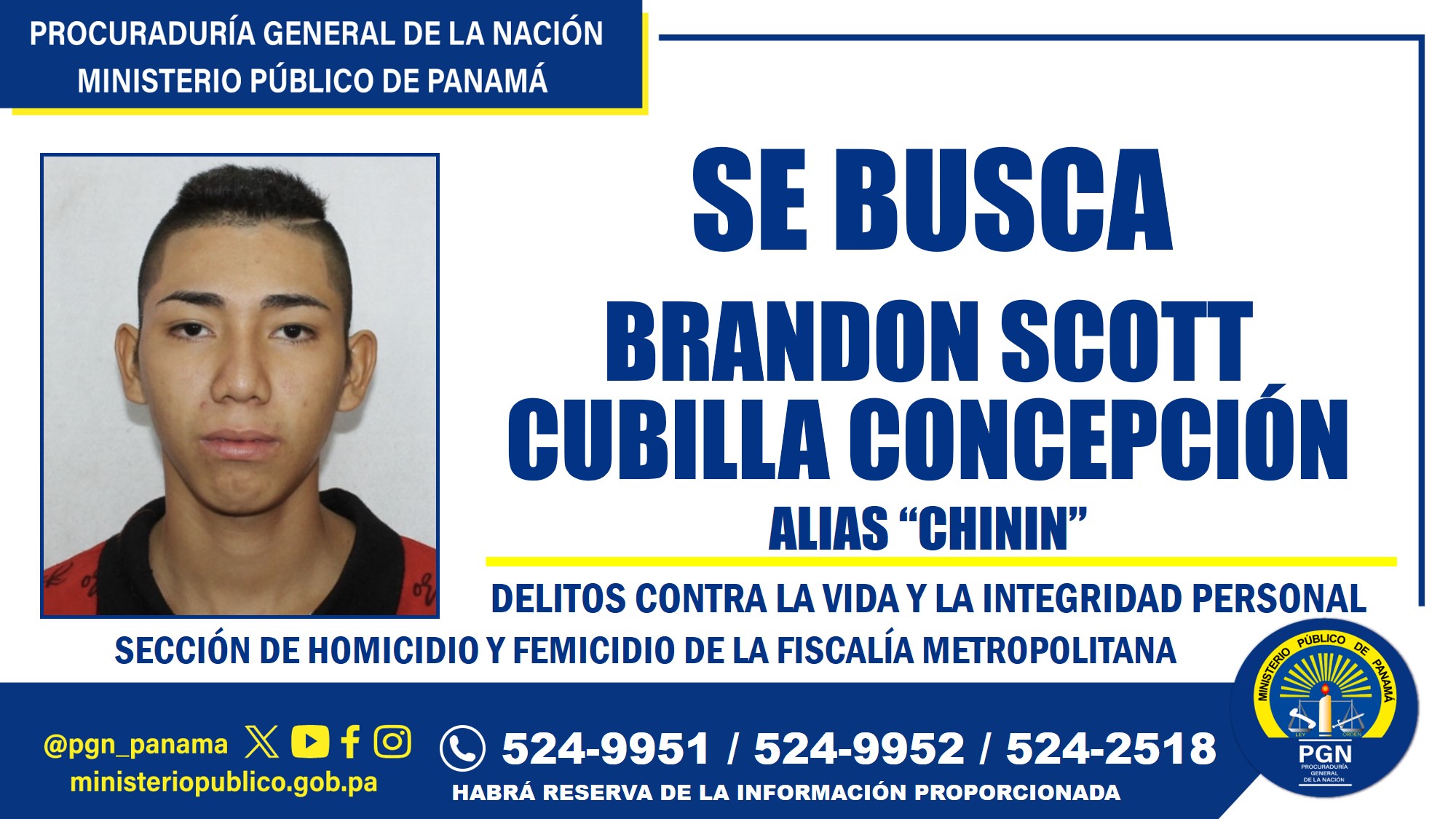 La Sección de Homicidio y Femicidio, de la Fiscalía Metropolitana, solicita la colaboración de la ciudadanía para ubicar al ciudadano, Brandon Scott Cubilla Concepción, alias “Chinín”, con cédula, 8-968-1015, requerido con orden de aprehensión, por los delitos de homicidio doloso agravado y homicidio en grado de tentativa, ocurrido en Las Paredes, 24 de Diciembre.
