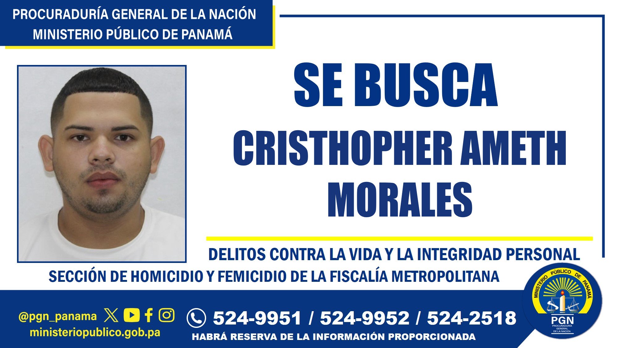La Sección de Homicidio y Femicidio, de la Fiscalía Metropolitana, solicita la colaboración de la ciudadanía para dar con el paradero de Cristhopher Ameth Morales alias “Chiri” con cédula 4-813-993, requerido por tentativa de homicidio.