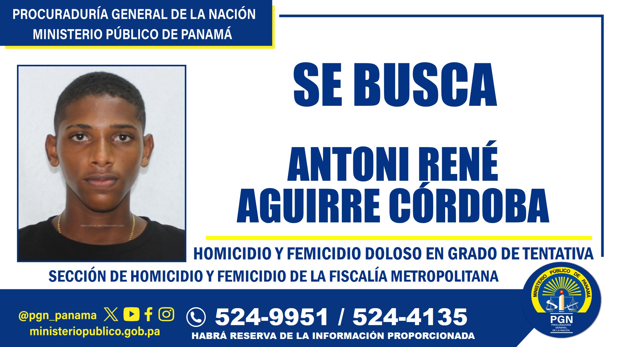La Sección de Homicidio y Femicidio de la Fiscalía Metropolitana solicita la colaboración de la ciudadanía para dar con el paradero de Antoni Rene Aguirre Córdoba con cédula de identidad personal N°8-1038-1793.