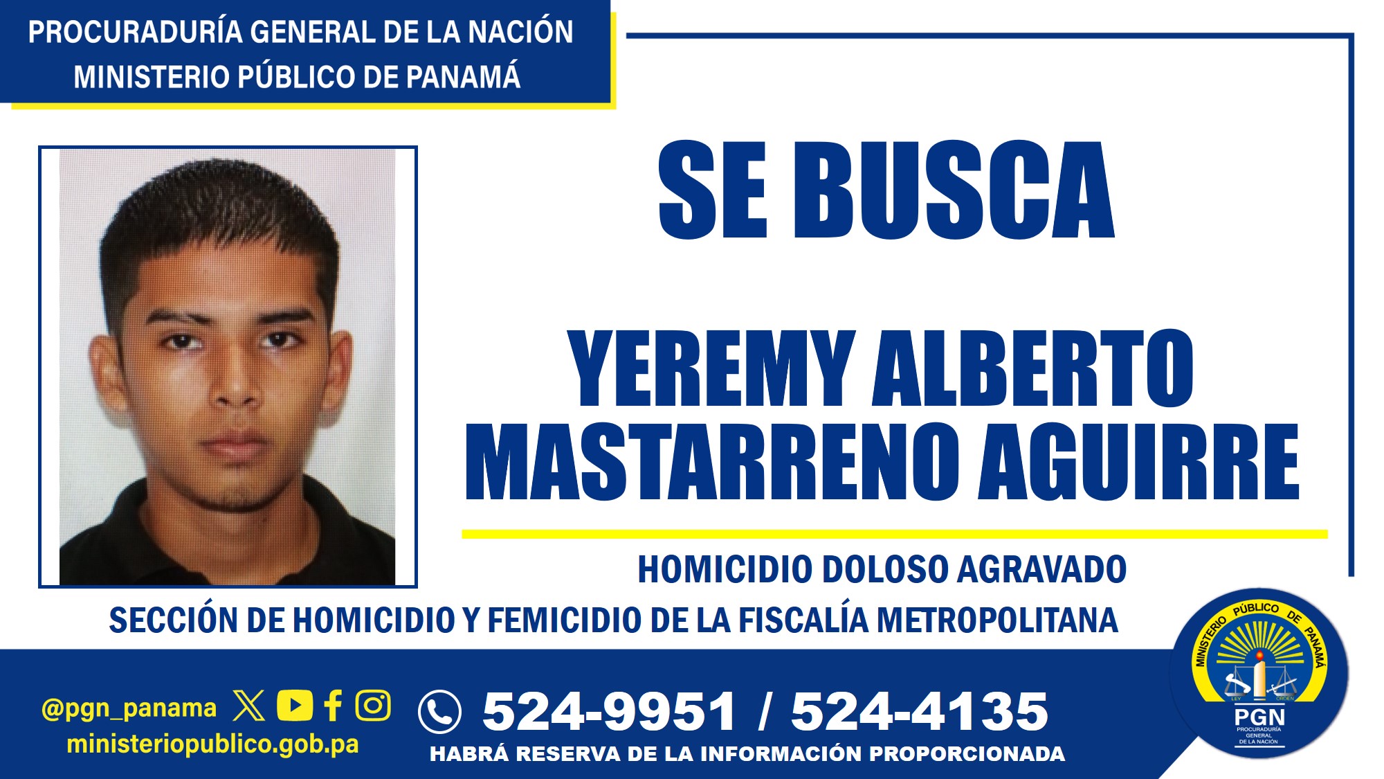 La Sección de Homicidio y Femicidio de la Fiscalía Metropolitana solicita la colaboración de la ciudadanía para dar con el paradero de Yeremy Alberto Mastarreno Aguirre con cédula de identidad personal N°8-1029-1239.