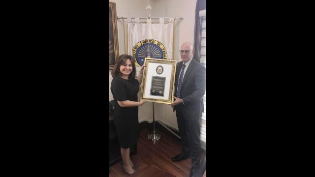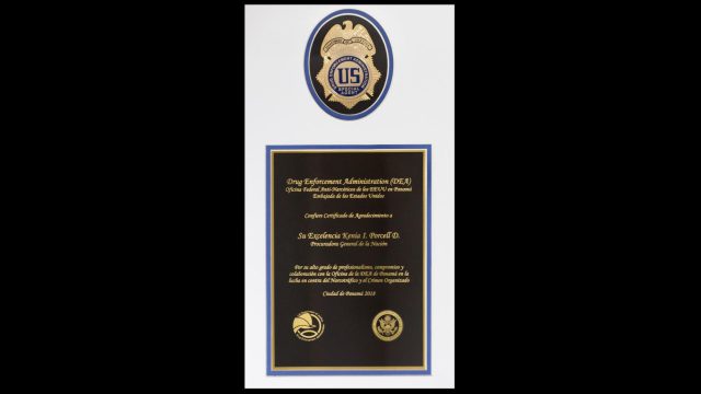 Por su permanente colaboración en la lucha contra el Narcotráfico, la Delincuencia Organizada y la Cooperación Penal, el Asistente del Director Regional de la DEA, Peter Reilly le entregó un reconocimiento a la Procuradora General de la Nación de Panamá, Kenia I. Porcell D.