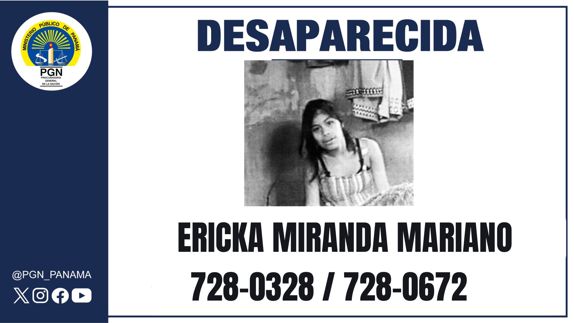 La Agencia Subregional de Bugaba, mantiene investigación, tras la desaparición de la ciudadana Ericka Miranda Mariano de 22 años de edad, de quien se desconoce su paradero desde el 7 de enero del 2025.