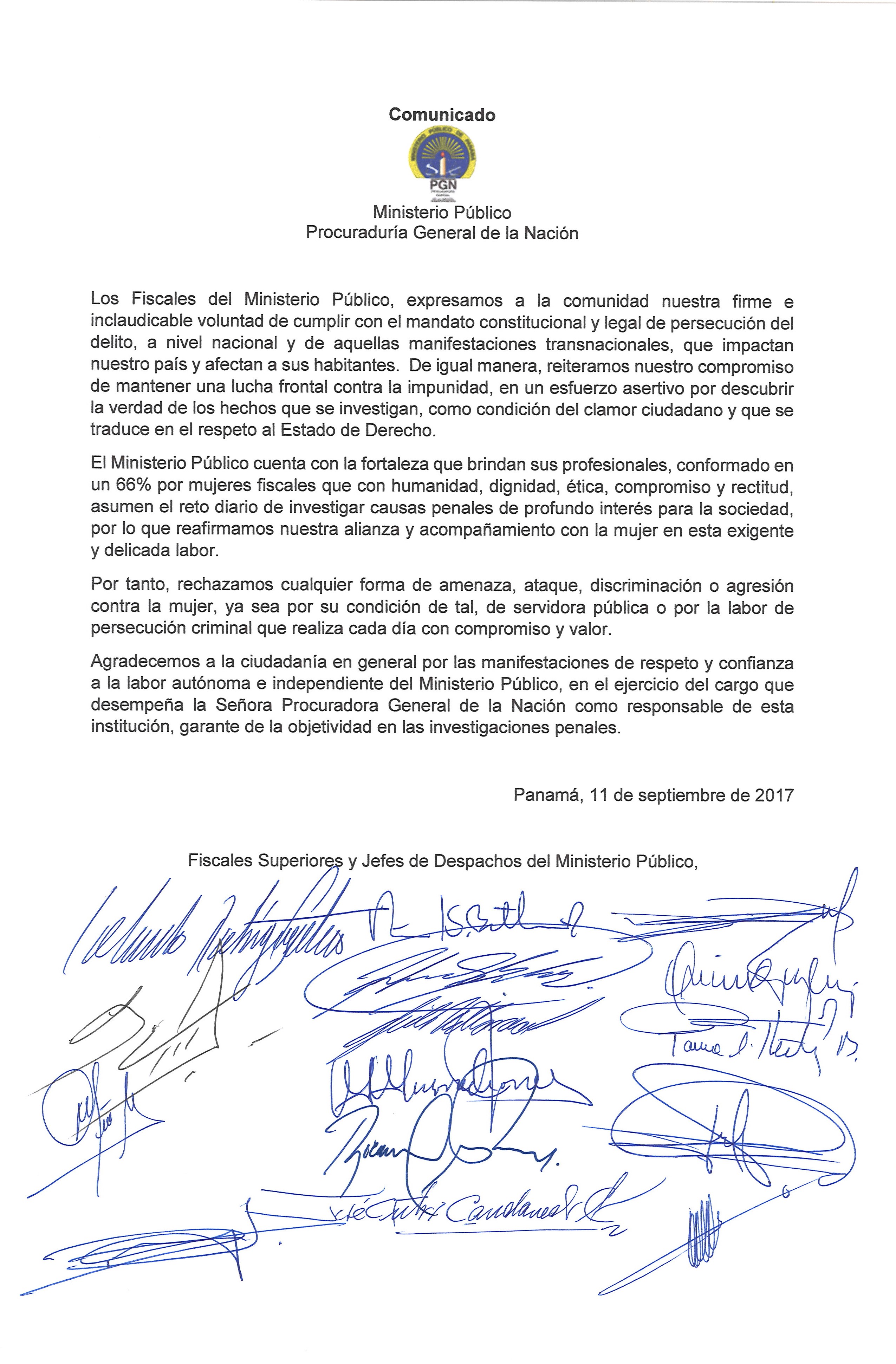 Los Fiscales del Ministerio Público, expresamos a la comunidad nuestra firme e inclaudicable voluntad de cumplir con el mandato constitucional y legal de persecución del delito, a nivel nacional y de aquellas manifestaciones transnacionales, que impactan nuestro país y afectan a sus habitantes. De igual manera, reiteramos nuestro compromiso de mantener una lucha frontal contra la impunidad, en un esfuerzo asertivo por descubrir la verdad de los hechos que se investigan, como condición del clamor ciudadano y que se traduce en el respeto al Estado de Derecho.