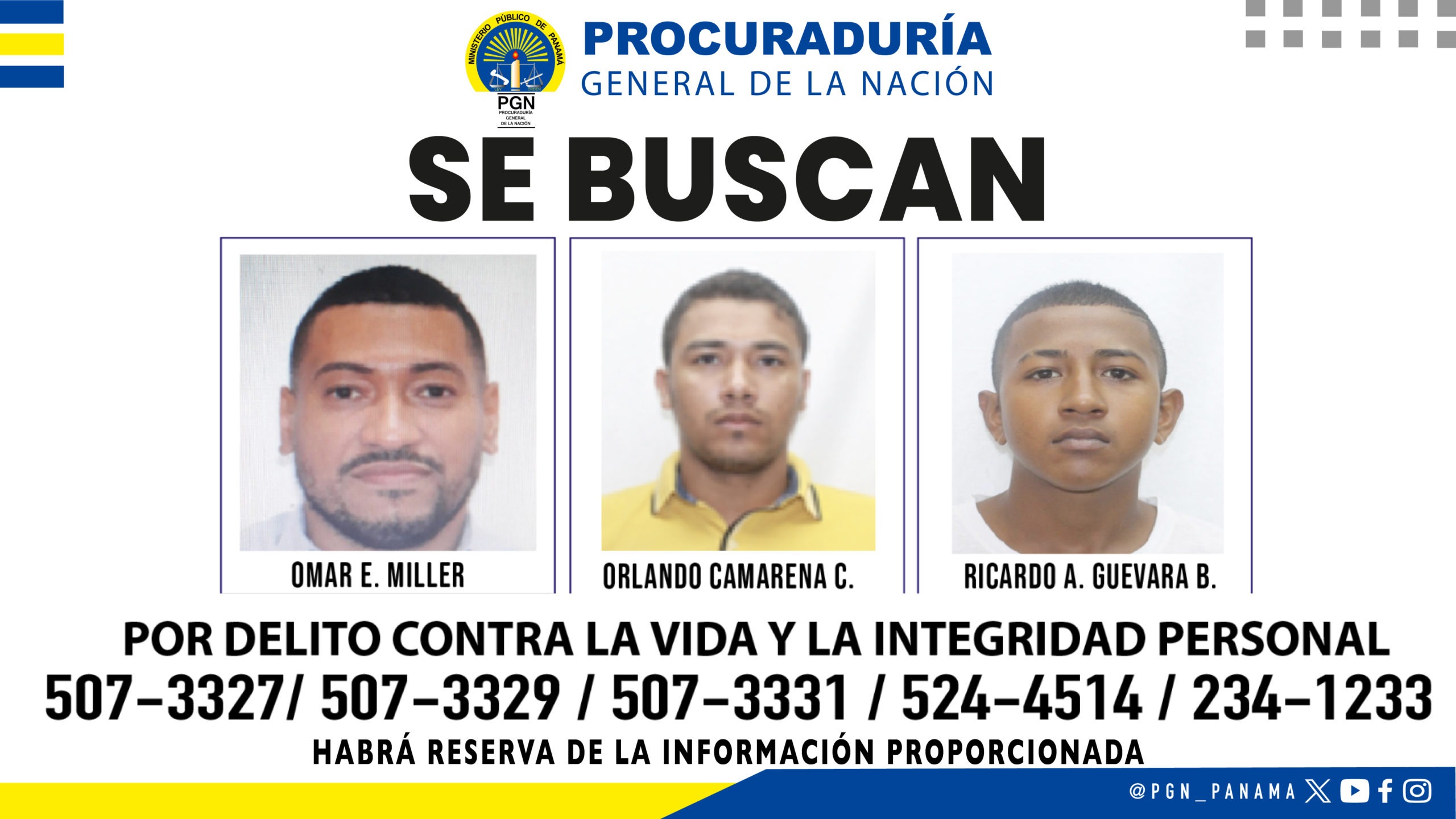 La Fiscalía Regional de San Miguelito, a través de la Sección de Homicidio y Femicidio, pide la colaboración de la ciudadanía para dar con el paradero de 3 personas vinculadas a diferentes hechos relacionados con delitos contra la vida e integridad personal.