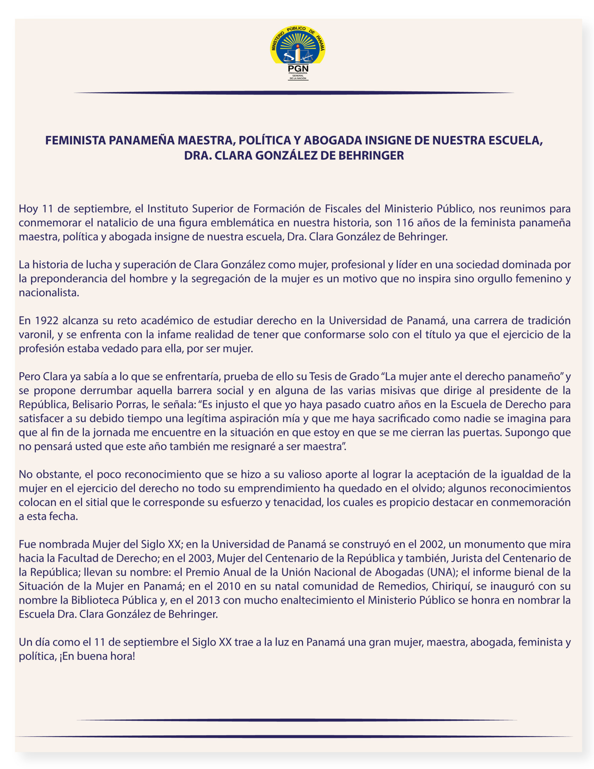 Hoy 11 de septiembre, el Instituto Superior de Formación de Fiscales del Ministerio Público, nos reunimos para conmemorar el natalicio de una figura emblemática en nuestra historia, son 116 años de la feminista panameña maestra, política y abogada insigne de nuestra escuela, Dra. Clara González de Behringer.