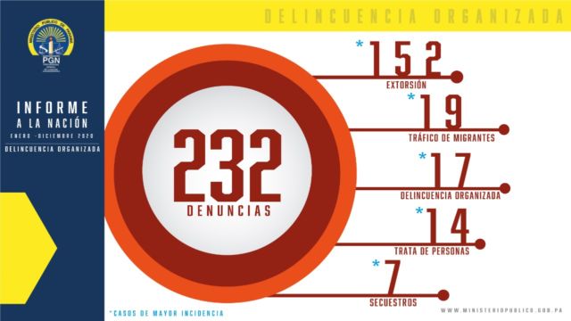 El Fiscal Superior Emeldo Márquez y su equipo de trabajo en el 2020, receptaron 232 denuncias, de las cuales 152 corresponden al delito de extorsión, 19 por Tráfico de Migrantes, 17 por Delincuencia Organizada, 14 por Trata De Personas, 7 Secuestros y 23 por otros delitos.