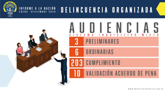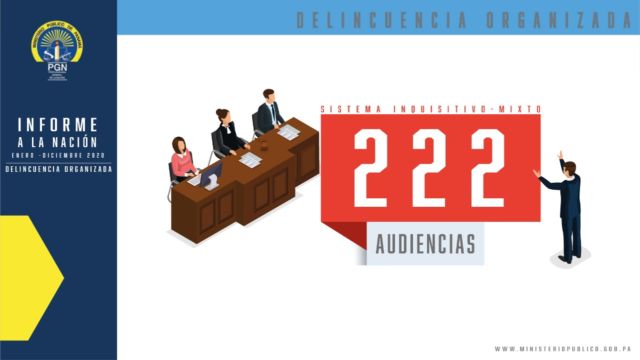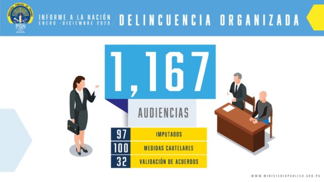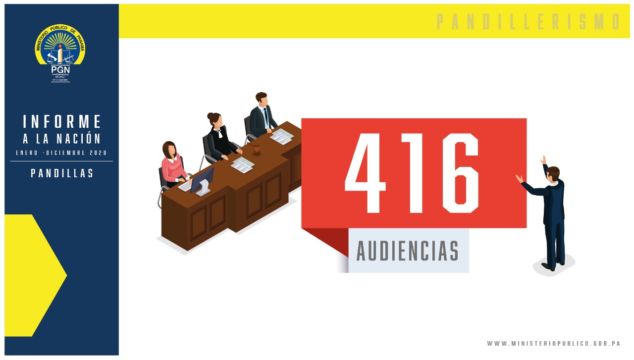 Por su parte la Fiscalía Superior Especializada en Delitos de Asociación Ilícita (pandillerismo) a cargo del Fiscal Nahaniel Murgas, durante el periodo comprendido del 1 de enero al 31 de diciembre de 2020, realizó un total de 416 audiencia de las 454 que estaban programadas.