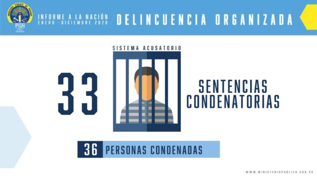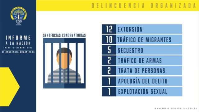En cuanto a las condenas se registraron 38 sentencias condenatorias, 12 por el delito de Extorsión, 2 por Trata de Personas, 10 por Tráfico de Migrantes, 5 por Secuestro, 2 Tráfico de armas y 1 por Apología del Delito y, 1 por Explotación Sexual Comercial, a través de las cuales fueron condenadas 35 personas.