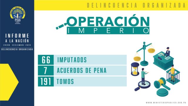 Operación Imperio: Este caso guarda relación con el delito Contra la Seguridad Colectiva, en la modalidad de Delincuencia Organizada, donde se tiene un total de sesenta y seis (66) personas imputadas; habiéndose realizado siete (7) acuerdos de pena y actualmente en negociación se mantienen cinco (5); este proceso consta de ciento noventa y un (191) tomos.