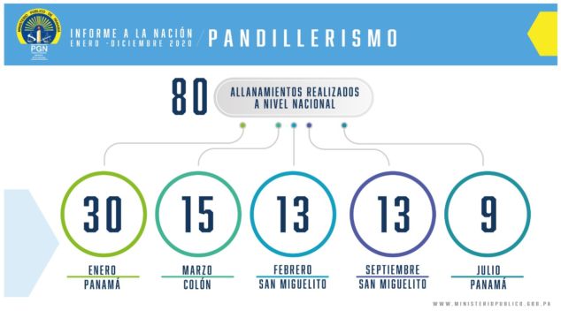 La Fiscalía con el apoyo de los diferentes estamentos de seguridad realizó un total de 80 allanamientos, en Panamá, San Miguelito y Colón, lográndose la aprehensión de 74 miembros de pandillas que operaban a nivel nacional.