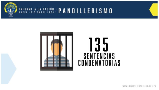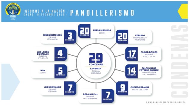Las provincias con mayor sentencias condenatorias están Panamá, con 29 personas sentenciadas, pertenecientes a la pandilla conocida como “La Vereda”, la cual operaba en el corregimiento de Curundú; 20 condenas para integrantes de la agrupación ilícita “Verabag” en Panamá Oeste (Veracruz); “Los Niños Sufridos” que operaba en Colón, con 20 personas condenadas y 17 personas de la pandilla “Ciudad de Dios”, la cual actuaba en Casco Viejo, entre otras.