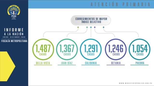 Entre los corregimientos de mayor incidencia de casos presentados esta Bella Vista con 1,487; Juan Díaz con 1,367; Calidonia con 1,291; Betania con 1,246; y Pacora con 1,054 hechos delictivos.