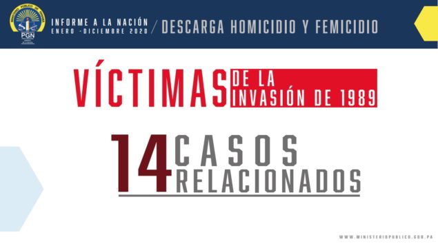 Víctimas de la invasión de 1989: Actualmente esta Fiscalía investiga, por orden del Segundo Tribunal Superior de Justicia, catorce (14) casos relacionados con víctimas de la Invasión estadounidense a Panamá, el 20 de diciembre de 1989, de los cuales 7 expedientes se identifican con los nombres de las víctimas, y en los otros 7 se investigan cadáveres no identificados. Además, se enviaron al Segundo Tribunal Superior de Justicia 2 solicitudes de reapertura.