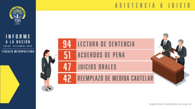 En el 2020 se realizaron 346 audiencias, de las cuales 94 fueron de Lectura de Sentencia, 51 de Acuerdo de Pena, 47 de Juicio Oral, 42 de Reemplazo de Medida Cautelar y otras.
