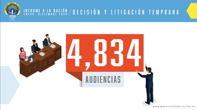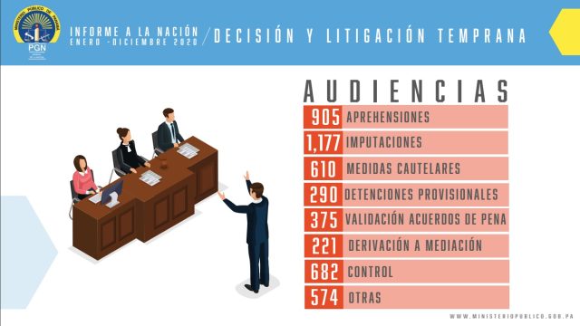 Se realizaron 4,834 audiencias de las cuales 905 corresponden a apelaciones, 1,177 imputaciones, 610 a medidas cautelares, 290 a detenciones provisionales, 375 a validación de acuerdos de pena, 221 a derivación de mediación, 682 control y 574 otras.