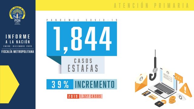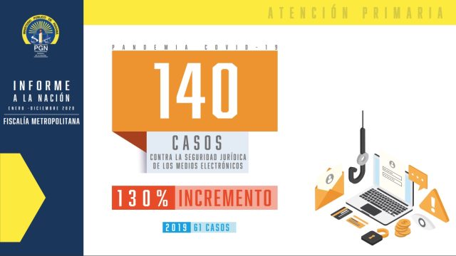 En cuanto al incremento de casos durante la pandemia del Covid-19 el delito Contra la Seguridad Jurídica muestra un incremento del 130% con 140 casos en el año 2020, registrados en la sección de Atención Primaria, superior al 2019 en el cual se dieron 69 casos; igualmente el delito de estafa se incrementó en un 39% con 1,844 casos, cifra superior al 2019 cuando se dieron 1,327 casos.