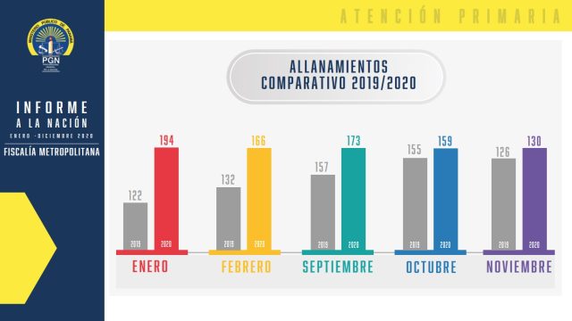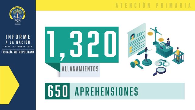 Se realizaron durante el 2020 1,320 allanamientos, el mayor decomiso fue de sustancias ilícitas y armas de fuego. Como resultado de estas diligencias se dieron 650 aprehensiones.