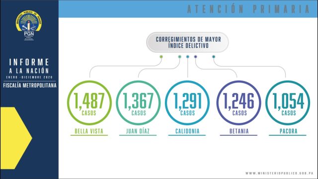 Entre los corregimientos de mayor incidencia de casos presentados esta Bella Vista con 1,487; Juan Díaz con 1,367; Calidonia con 1,291; Betania con 1,246; y Pacora con 1,054 hechos delictivos.