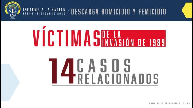 Víctimas de la invasión de 1989: Actualmente esta Fiscalía investiga, por orden del Segundo Tribunal Superior de Justicia, catorce (14) casos relacionados con víctimas de la Invasión estadounidense a Panamá, el 20 de diciembre de 1989, de los cuales 7 expedientes se identifican con los nombres de las víctimas, y en los otros 7 se investigan cadáveres no identificados. Además, se enviaron al Segundo Tribunal Superior de Justicia 2 solicitudes de reapertura.