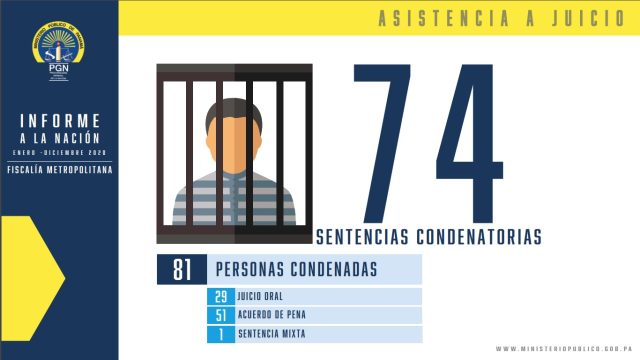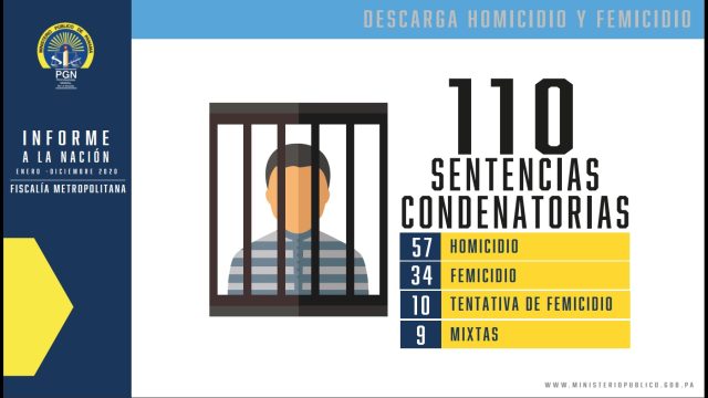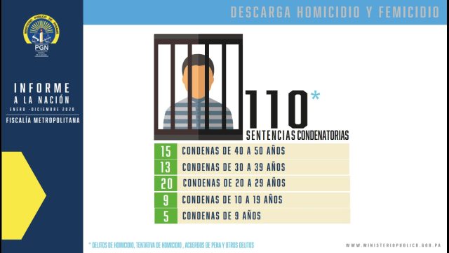 Condenas: Se lograron 110 sentencias condenatorias, 57 sentencias por homicidio; 34 por Femicidio, 10 por Tentativa de Femicidio y 9 Mixtas. De estas, se lograron 15 condenas de 50 a 40; 13 de 39 a 30 años de prisión; 20 por 29 a 20 años de prisión, por delito de Homicidio y otros; y 9 de 19 a 10 años de prisión por Tentativa de Homicidio y acuerdos de pena; además 5 de 9 años de prisión por acuerdo de pena.