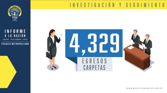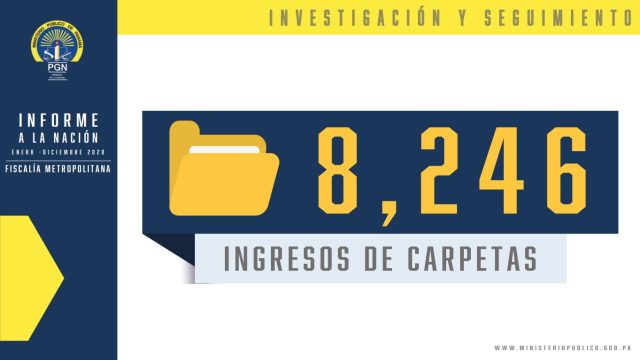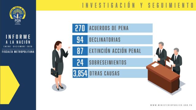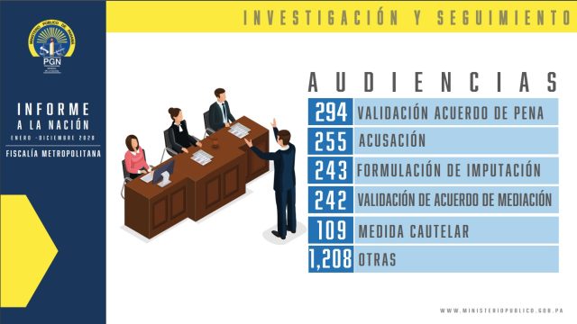Sección de Investigación y Seguimiento de Causa: En la Sección de Investigación y Seguimiento de Causa del área Metropolitana, donde se encuentra a cargo en este momento el Fiscal Ricardo González, de enero a diciembre de 2020, ingresó un total de 8246 carpetas, se realizaron 2,929 audiencias, de las cuales 333 fueron innominadas, 294 validación de acuerdo de pena.