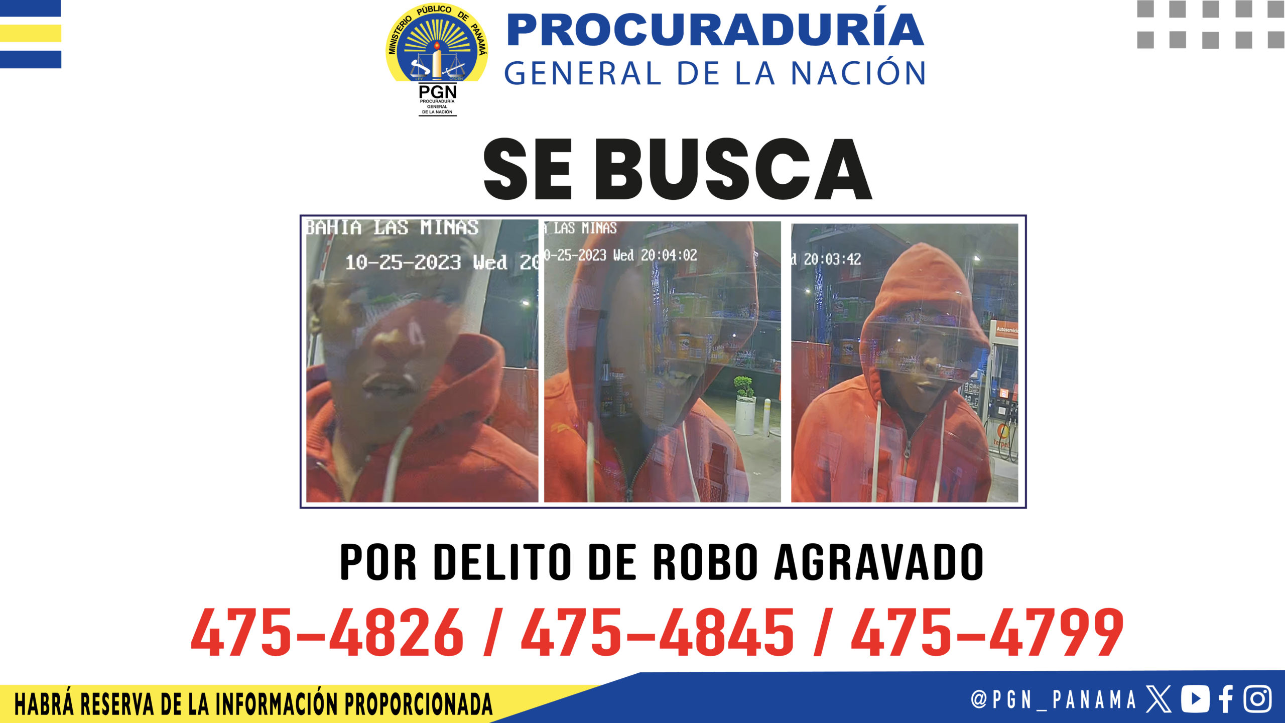 La Sección de Primera de Delitos contra el Patrimonio Económico de la Fiscalía Regional de Colón y Guna Yala, solicita la colaboración de la ciudadanía para conocer la identidad y el paradero del ciudadano que aparece en las imágenes adjuntas, requerido por su presunta vinculación al delito de robo agravado.