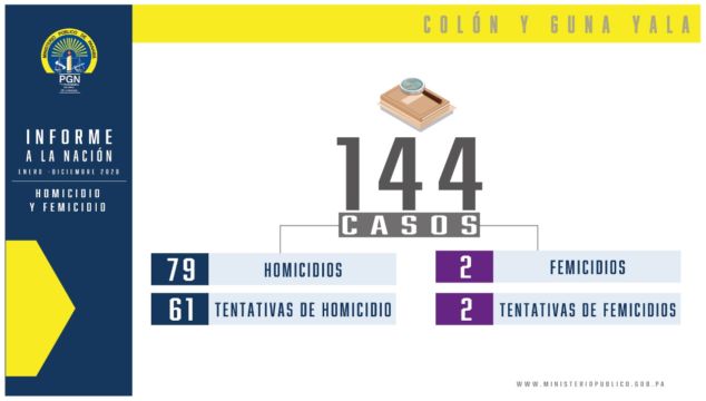 La Sección de Homicidio y Femicidio durante el 2020 reportó 144 casos, de los cuales 79 corresponden a casos de homicidio, 61 por tentativa de homicidio, 2 femicidios y 2 tentativa de femicidio. Los corregimientos de mayor incidencia por delitos contra la Vida y la Vida y la Integridad Personal fueron Cristóbal con 60 casos, Cativá con 25, Puerto Pilón 17, Barrio Norte 13 casos y Sabanitas 9.