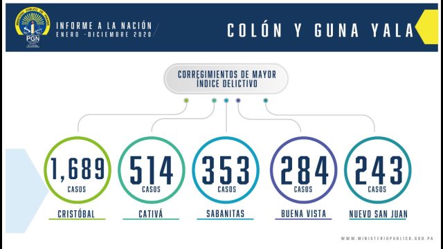 Los corregimientos donde se reportó la mayor comisión de los delitos son: Cristóbal con 1,689 casos, Cativá 514, Sabanitas 353, Buena Vista 284 y Nuevo San Juan con 243 casos.