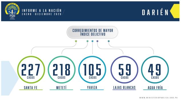Los cinco corregimientos con mayor índice de delictivo registrados durante este período en la provincia fueron los siguientes: Santa Fe con 227 casos, Metetí con 218, Yaviza con 105, Lajas Blancas con 59 y Agua Fría con 49 causas.