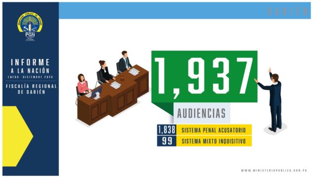 De esta misma forma participaron en 1,937 audiencias, de las cuales 1,838 se realizaron bajo el Sistema penal Acusatorio (SPA) y 99 en el sistema mixto inquisitivo. Entre las audiencias realizadas en el SPA 568 fueron de cumplimiento, 269 de imputaciones, 166 de medidas cautelares, 149 legalización de aprehensión, 144 de acuerdo de pena, entre otras.