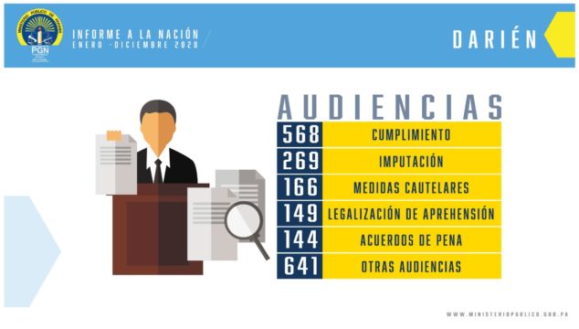 En cuanto a las sentencias condenatorias el Ministerio Público en Darién logró 162 de las cuales 143 corresponden al Sistema Penal Acusatorio y 19 del Sistema Mixto Inquisitivo. De esta misma forma fueron condenadas 180 personas, de las cuales 161 fueron procesadas en el Sistema Penal Acusatorio y 19 en el sistema Mixto inquisitivo.