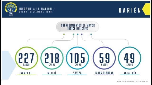 Los cinco corregimientos con mayor índice de delictivo registrados durante este período en la provincia fueron los siguientes: Santa Fe con 227 casos, Metetí con 218, Yaviza con 105, Lajas Blancas con 59 y Agua Fría con 49 causas.