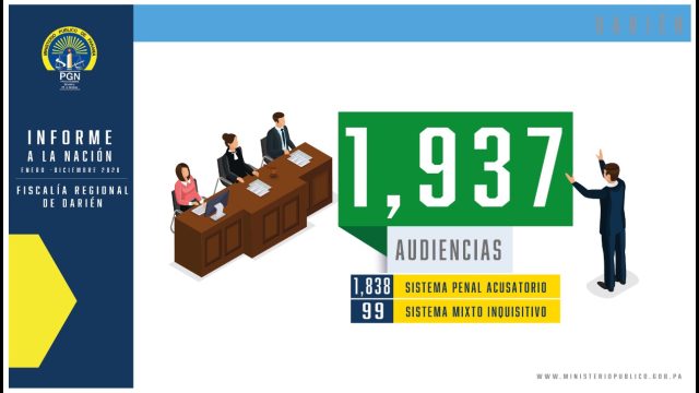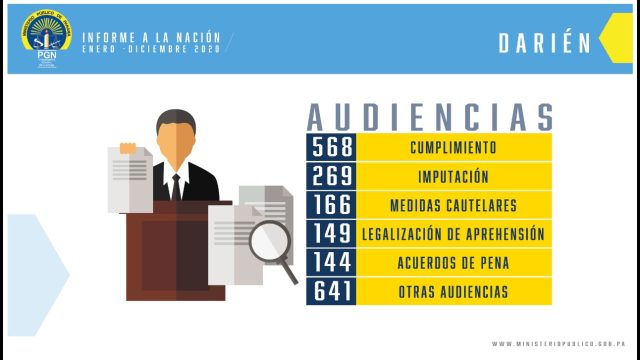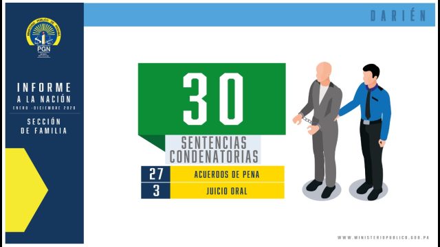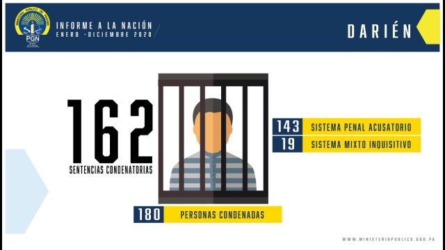 En cuanto a las sentencias condenatorias el Ministerio Público en Darién logró 162 de las cuales 143 corresponden al Sistema Penal Acusatorio y 19 del Sistema Mixto Inquisitivo. De esta misma forma fueron condenadas 180 personas, de las cuales 161 fueron procesadas en el Sistema Penal Acusatorio y 19 en el sistema Mixto inquisitivo.