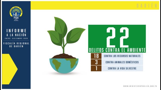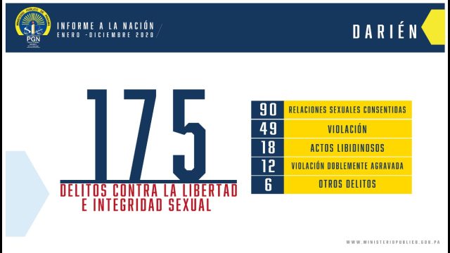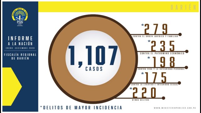La Fiscalía Regional de la provincia de Darién durante el año 2020 registró 1,107 casos por diversos delitos, siendo los de mayor incidencia contra el orden jurídico y familiar con 279 casos, seguido del delito contra el patrimonio económico con 235, contra la vida y la integridad personal con 198, contra la libertad e integridad sexual 175, entre otros, así lo dio a conocer el Fiscal Superior Julio Vergara durante la presentación del informe de gestión ante los medios de comunicación social.