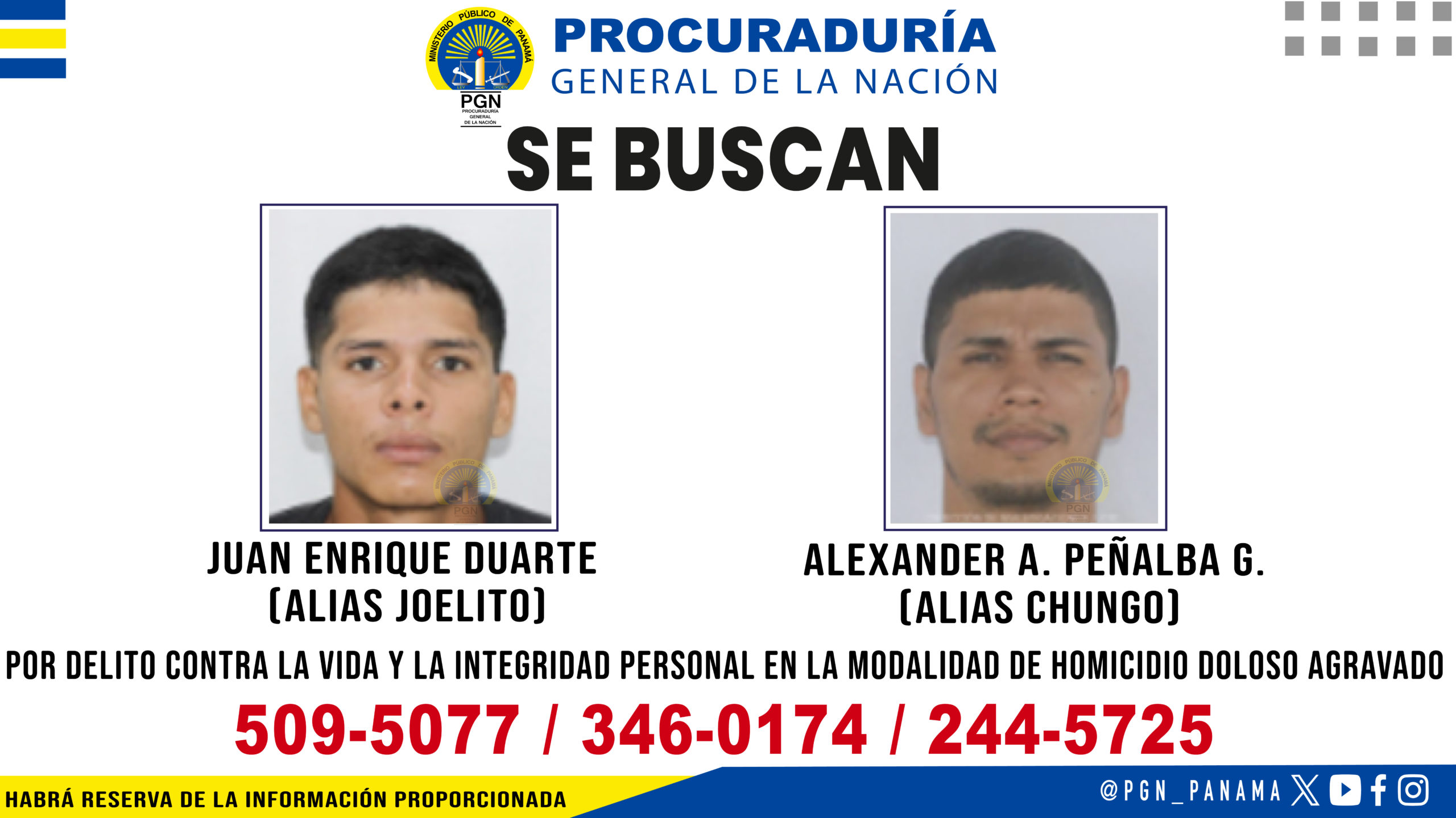 Además, se solicita ubicar también a Juan Enrique Duarte, alias “Joelito” por el homicidio registrado el 7 de septiembre de 2024, en el sector de Rincón Bellaco, corregimiento de Veracruz, distrito de Arraiján.