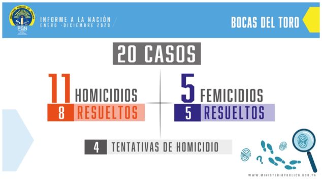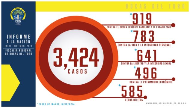 Como resultado de ello, en la provincia de Bocas del Toro se atendieron 3,424 casos, de los cuales los delitos que marcaron mayor incidencia en el año 2020 son los relacionadados contra el orden jurídico y familiar y el estado civil con 919 casos, seguidos por delito delito contra la vida y la integridad personal con 783, y los delitos contra la libertad e integridad sexual con 641 casos.