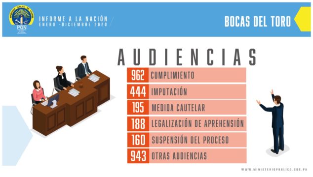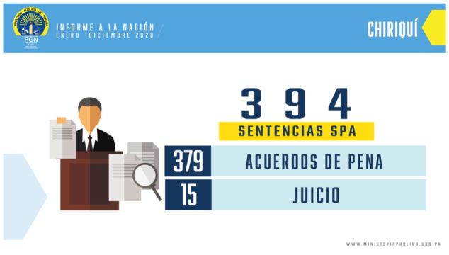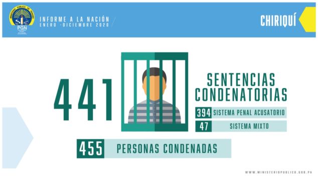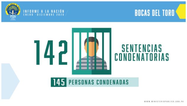 Sobre las sentencias se puede informar que durante el mismo período la Fiscalía de Bocas del Toro, logró obtener 142 sentencias condenatorias, lo cual permitió condena para 145 personas, lo que representa efectividad en un 99% de los casos resultados de forma positiva ente los Tribunales de Justicia.