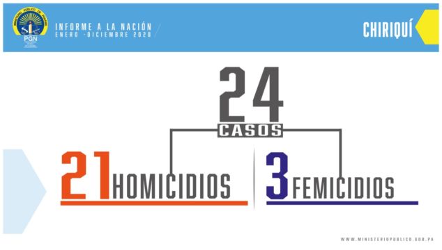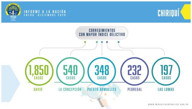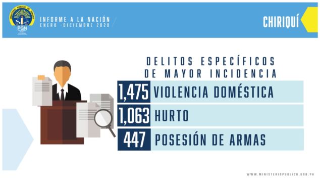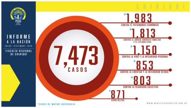 Por su parte la Fiscalía Regional de Chiriquí, atendió 7,473 noticias criminales, de las cuales se pueden señalar las de mayor incidencia los delitos contra el patriminio económico con 1,983 causas, seguidos de los delitos contra el orden juridico familiar con 1,813 casos, y los delitos delitos contra la vida y la integridad personal con 1,150 casos. Entre los delitos específicos marcaron en incidencia el delito de violencia doméstica con 1,475; seguido de hurtos con 1,063 casos. Asimismo se resalta 447 casos de posesión ilíctia de arma de fuego.